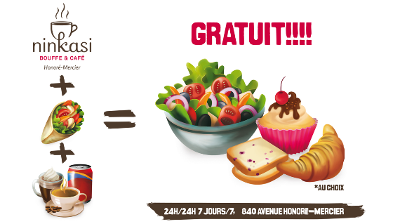 Achetez un sandwich ou wrap et un breuvage (terroir, régulier ou café) et obtenez une salade ou un dessert (viennoiseries, cup cake, pain déjeuner) GRATUITEMENT!